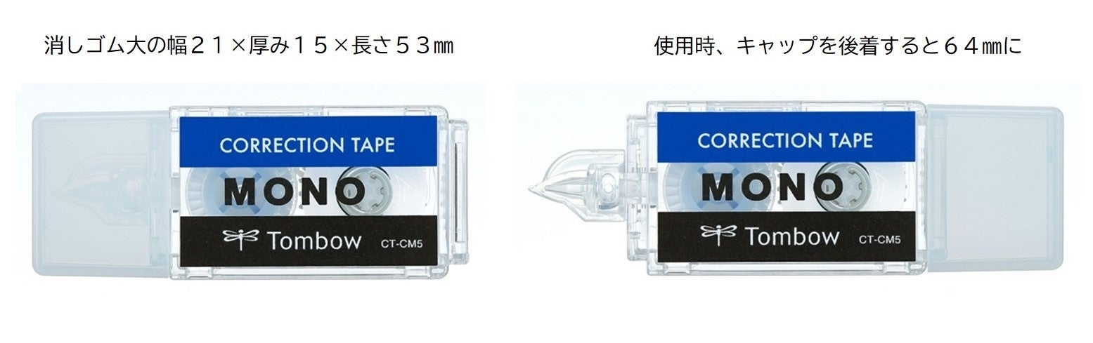 本体は幅21×厚み15×長さ53㎜で、当社修正テープの中で最小。大きさはほぼモノ消しゴムPE03大です(PE03:幅20×厚み11×長さ55㎜)。小型ながらキャップ(長さ16㎜)を外して後着すると長さは約2割伸びて(長さ64㎜に)手に安定します。