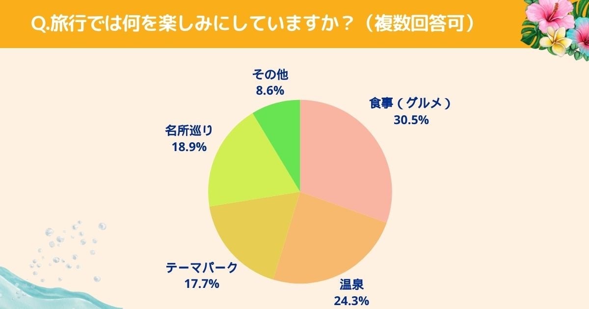 旅行で何を楽しみにしているかお聞きしたところ「食事(30.5%)」、「温泉(24.3%)」、「テーマパーク(17.7%)」、「名所巡り(18.9%)」、「その他(8.6%)」という結果になりました。