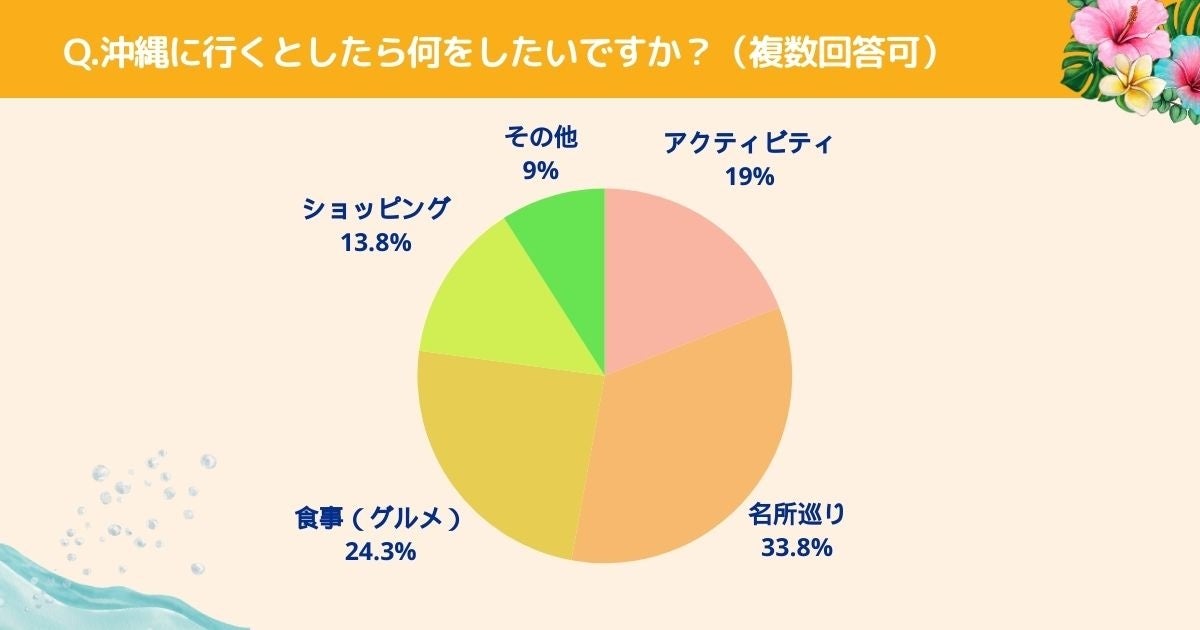 沖縄に行くとしたら何をしたいかお聞きしたところ「アクティビティ(19%)」、「名所巡り(33.8%)」、「食事(24.3%)」、「ショッピング(13.8%)」という結果になりました。