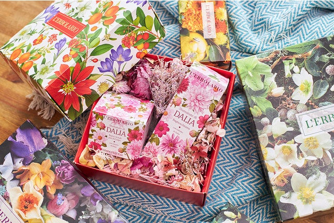 ボックスを開けた瞬間、レルボラリオの美しいパッケージとドライフラワーが特別なサプライズを演出してくれます。