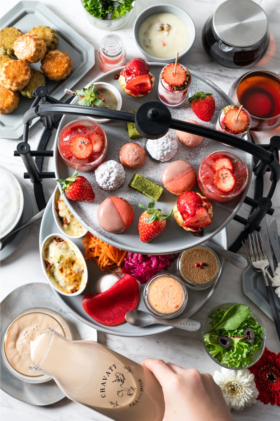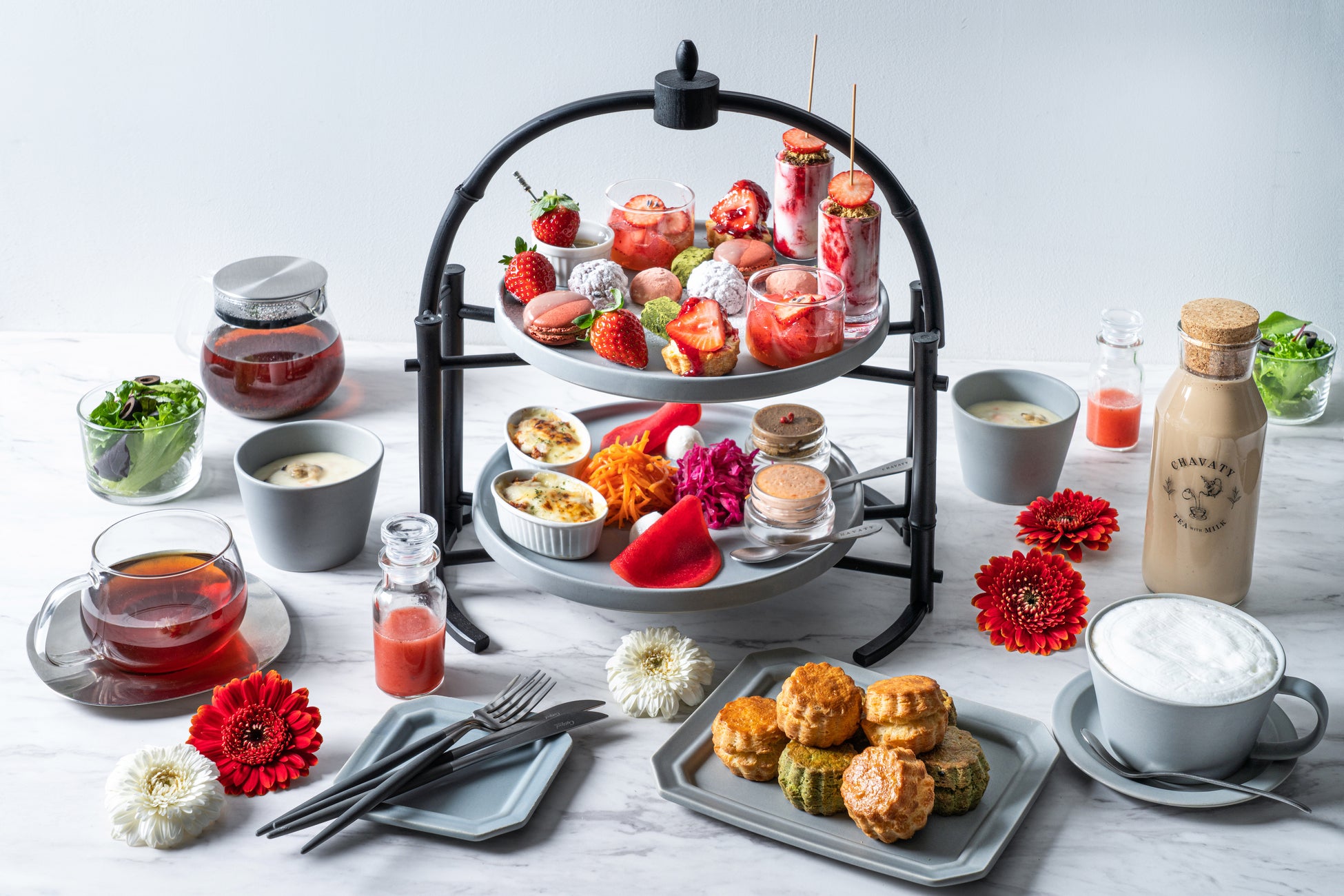 フレッシュないちごの味わいをディップで楽しむ「ほうじ茶練乳」や、ほのかにラベンダーが漂うウバゼリー入りの「いちごわらび餅」、木いちごのソースが鮮やかなマーブルのシャンティにほうじ茶きなこをのせた「団子のヴェリーヌ」、ルビーチョコレートをかけた「ストロベリーウバクリームのマカロン」など、いちごの華やかなラインナップに和洋を多彩に散りばめたスイーツの他、セイボリーメニューとして、グリーンハーブサラダには柑橘やハーブで深みを加えた「ストロベリーソースのドレッシング」を添え、「ラズベリービネガー漬けの紅芯大根」や濃厚な「クラムチャウダー」など、趣向を凝らしたテイストでお楽しみいただけるよう取り揃えました。