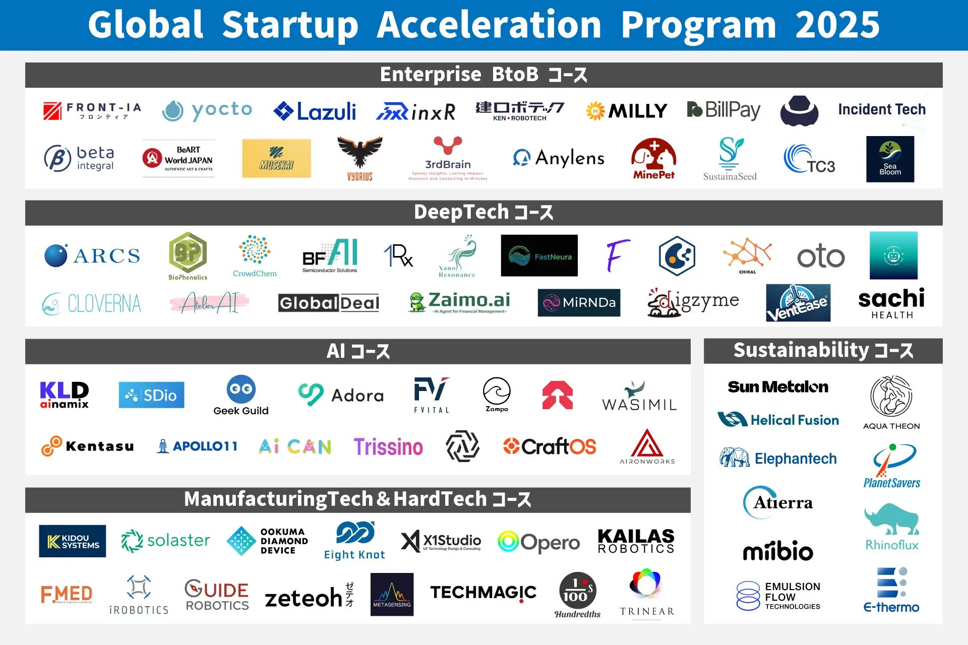 採択分野(2025年度):AI/DeepTech/Sustainability/Enterprise BtoB/Manufacturing Tech & HardTech