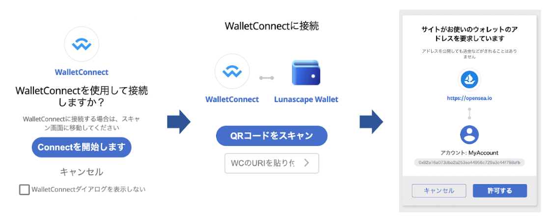 WalletConnectとは広く使われているWeb3接続プロトコルで、ウォレットとDAppsを簡単かつ安全に接続・ログインすることができます。これにより、Lunascape WalletはOpenSeaやメタバース関連のアプリケーション(DApps)との間で、QRコードのスキャンまたはディープリンクのクリックを介して暗号化された安全な接続を行います。また、このプロトコルにはトランザクションやその他のコールリクエストを行う際のプッシュ通知機能があり、ユーザーにトランザクションの通知や承認を要求することができます。