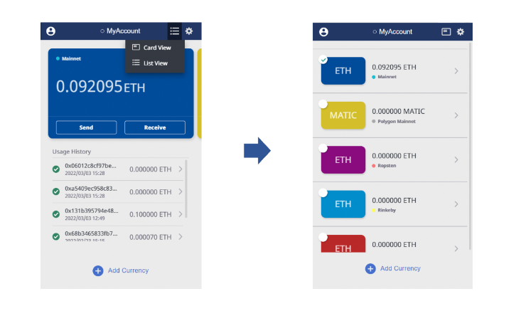 Lunascape Walletは初心者から上級者まで誰もが簡単に使えるデザインを追求しカード型のデザインを採用しています。昨今、多くのプロジェクトやトークンが公開される中、複数保有するトークンの一覧性を高めるためトークンのリスト表示に対応しました。
