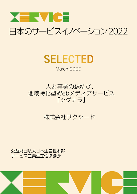 3月28日(火)、株式会社サクシード(所在地:栃木県宇都宮市平松本町/代表取締役:水沼啓幸 以下、サクシード(https://succeed-biz.jp/)が運営する成長意欲が高い地域企業(ツグナラ企業)をWEBサイトに掲載してきた「ツグナラ(https://tgnr.jp/)」は、この度、サービス産業生産性協議会主催の革新的な優れたサービスを幅広く選定し公表する「日本のサービスイノベーション2022」に選出されました。これはサービスイノベーションの最前線に立つ全92件の事例をまとめたものです。