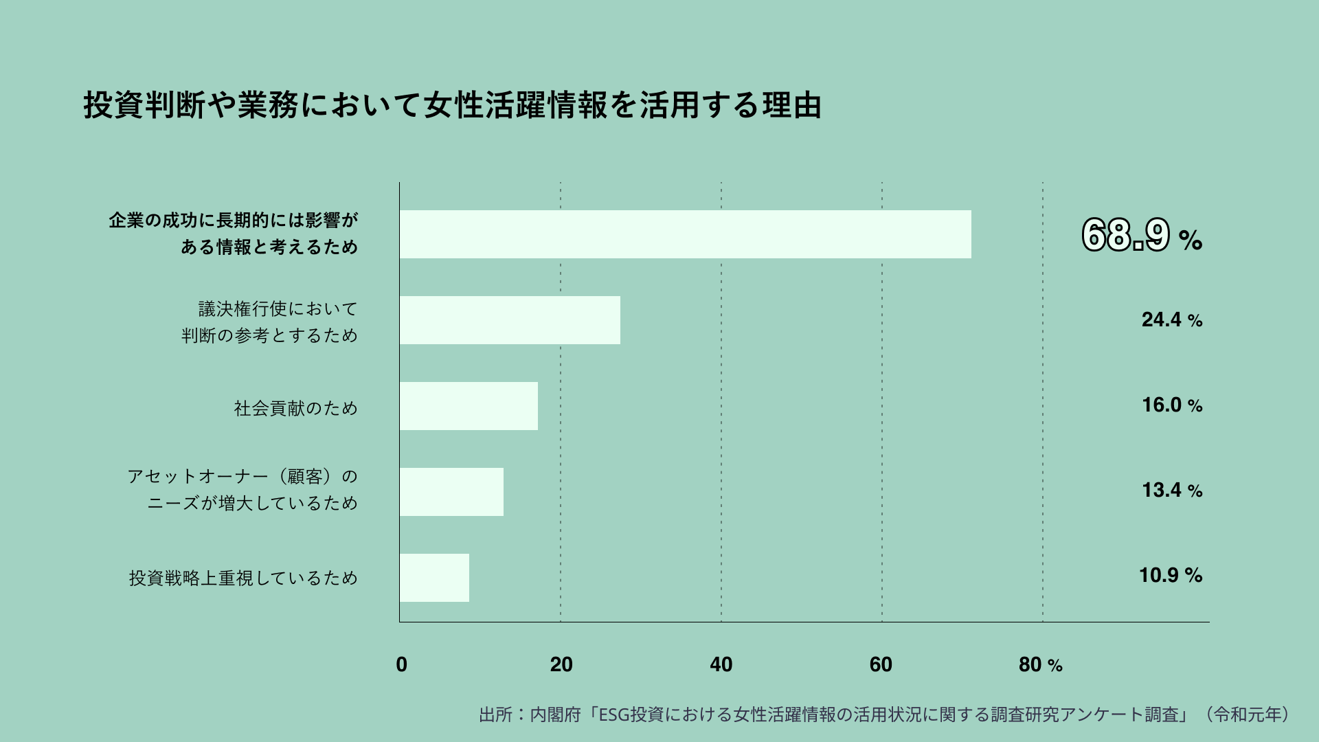 (投資家サイドも、2019年実施の内閣府の調査で、7割近くの機関投資家が投資に女性活躍情報を活用する理由として”女性の活躍推進が企業の業績に長期的に影響があると考える”と回答。女性役員比率の多い企業の方がパフォーマンスが高くなるという結果も)