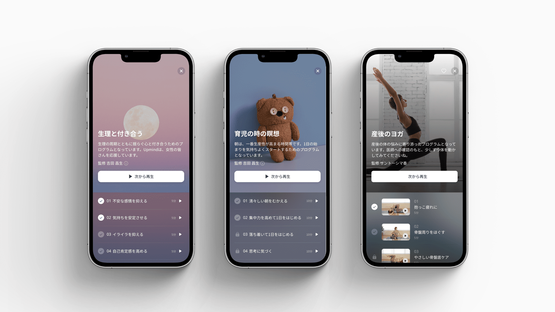 例えば、黄体期にイライラする感情を穏やかにしたり、生理期間に憂鬱な感情に備えるコンテンツ、イライラした感情を周囲にぶつけてしまった後でも自身の気持ちを優しく労わることを助けるコンテンツなどを用意しました。また、PMS・生理痛の症状が重い時でも取り組みやすいように2分や5分の短いコンテンツを中心に用意しました。
