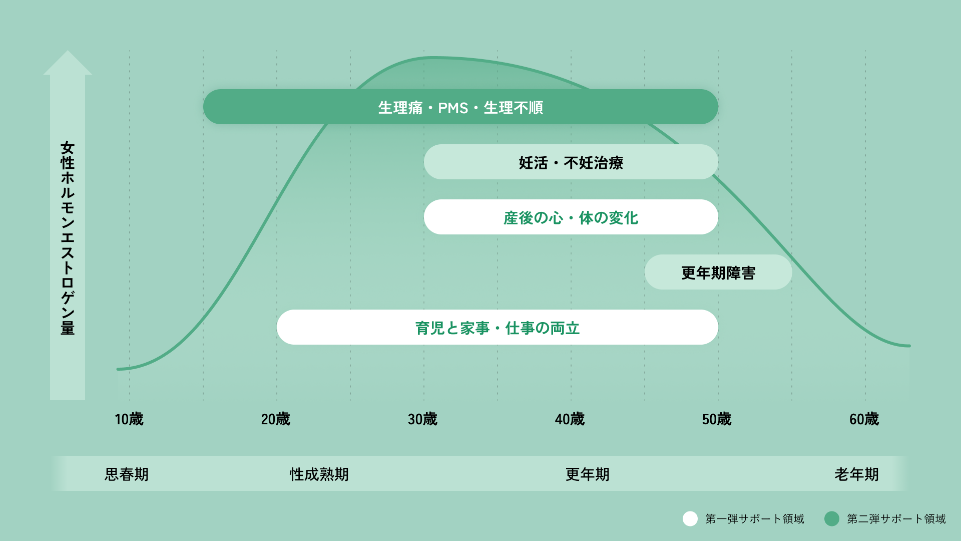 女性活躍が難しかった背景として、男性優位の社会である他に、月経周期、妊娠・出産、更年期といった女性ホルモンの変動がライフステージを通して常に心身に影響することや、家事・育児で負担が大きい、ことなどが主な理由としてあります。