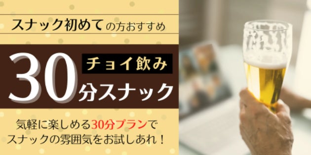 スナックに入ったことがない、上司と行ったことはあるけど一人は初めて・・・。スナック未経験者や初心者が気軽にスナックを楽しめる「チョイ飲み30分スナック」はいかがですか?対象スナックが、30分1000円〜というリーズナブルな価格で体験できる、スナックデビューにぴったりプランです。