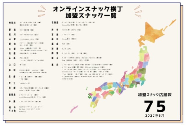 - 全国・世界のスナック75店舗が加盟するオンラインスナック横丁