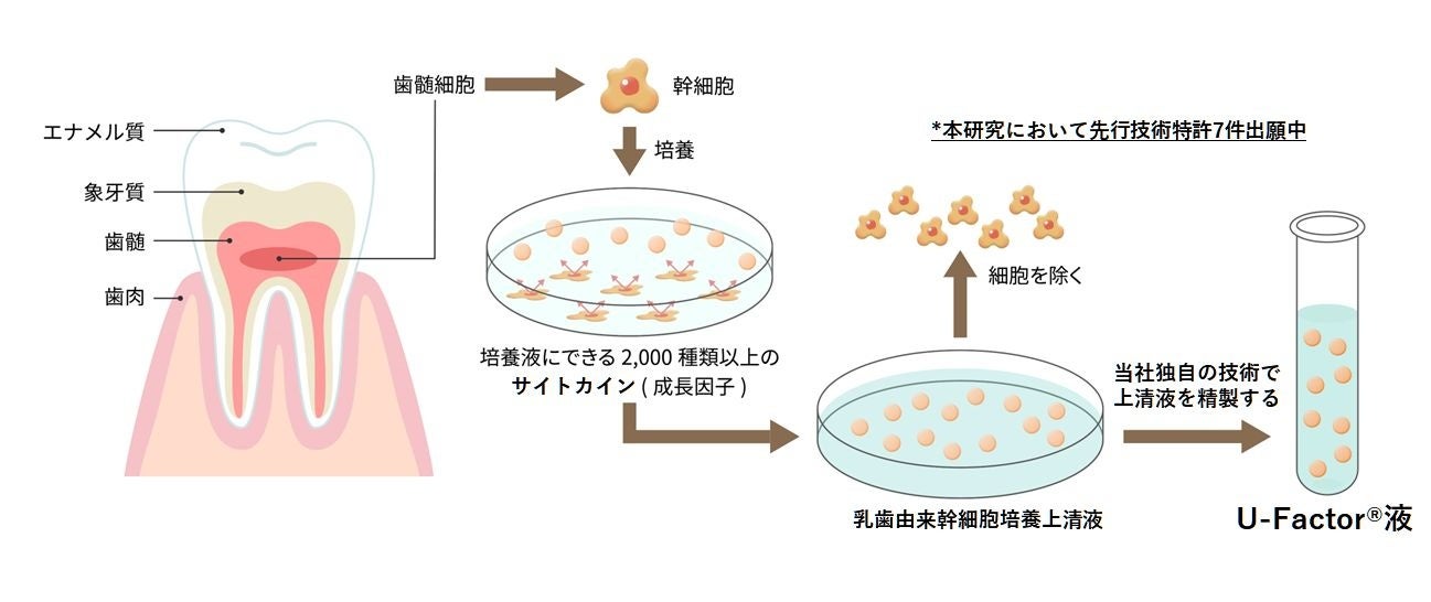当社は、幹細胞を培養する過程で得られる上澄み液を当社独自の技術を用いて精製を行い、純度の高い培養上清液をU-Factor®液 (商標登録番号:第6396893号)と名付けました。幹細胞より分泌された大量のサイトカイン(生理活性作用をもつタンパク質)を含んでおり、当社取締役であり名古屋大学大学院医学研究科名誉教授の上田実らが、その有効性を発見しました(M Ueda, et al. Neurosci 2015)。当社でさらに改良を重ねて特殊な方法で精製したU-Factor®液には、安全性と有効性に関して非常に大きな可能性があると考えています。