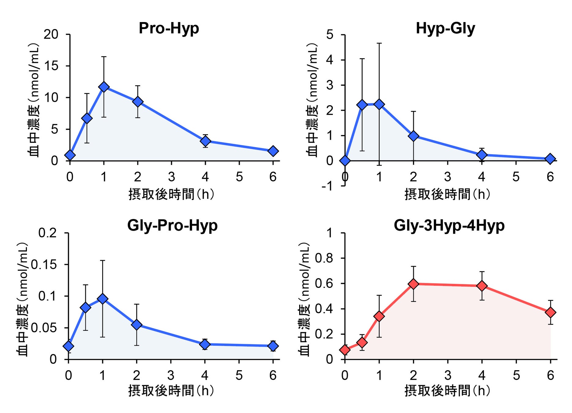 本研究で見出したコラーゲン由来ペプチドGly-3Hyp-4Hypは、その高い安定性と生理活性から、コラーゲン加水分解物摂取による健康効果に大きな役割を果たしている可能性もあります。3Hyp含量の多い原料から作ったコラーゲン加水分解物を摂取すると、Gly-3Hyp-4Hypの吸収量がさらに向上することも示されており(論文Fig. 5参照)、今後はGly-3Hyp-4Hypに特化したコラーゲン加水分解物を開発するとともに、その機能性を多角的に検証していく予定です。