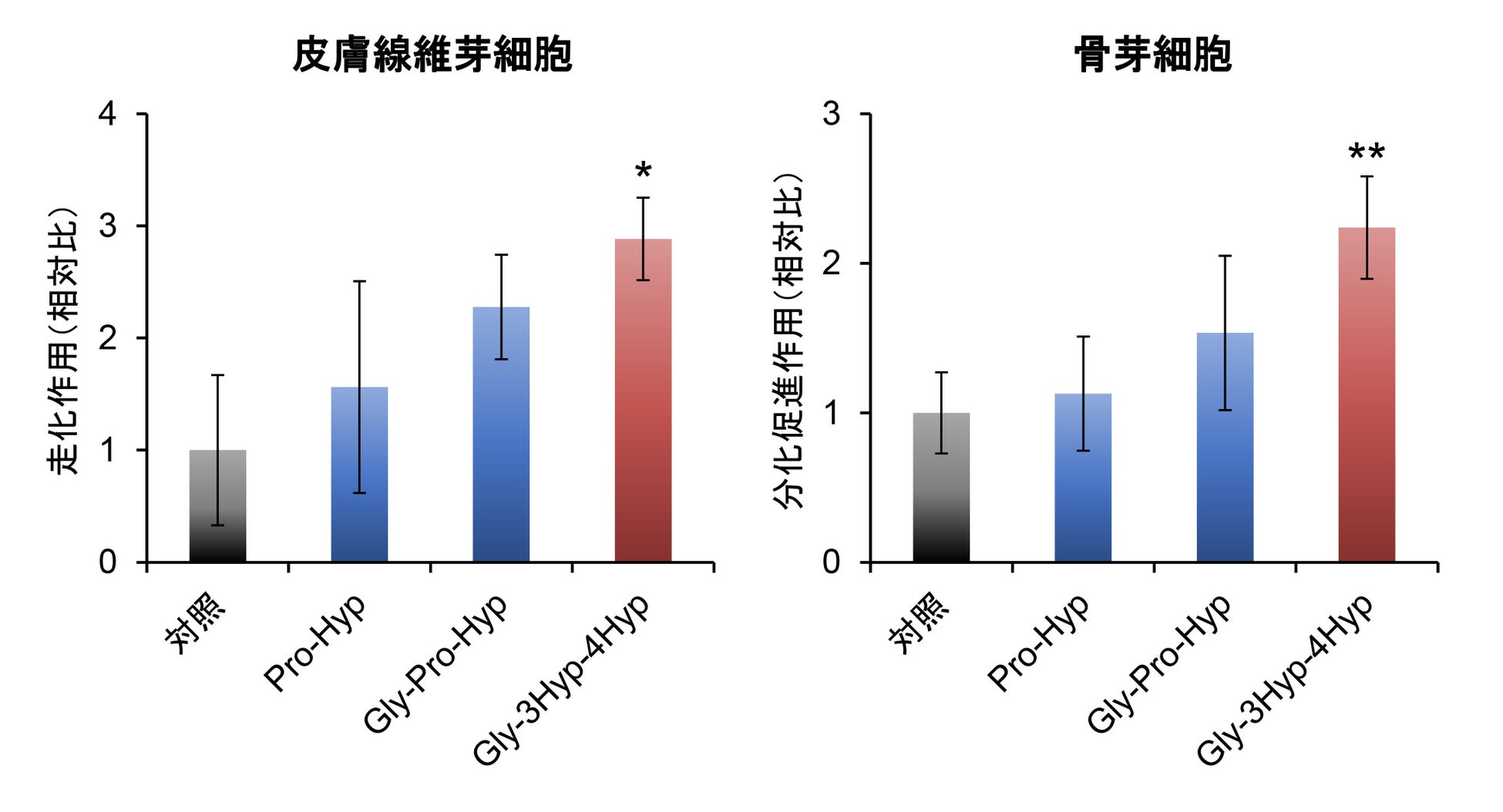 さらに、皮膚や骨においてコラーゲンを合成する細胞(皮膚線維芽細胞、骨芽細胞)に対する作用を評価した結果、Pro-HypやGly-Pro-Hypでは有意な効果は示されなかった一方で、Gly-3Hyp-4Hypはどちらの細胞に対しても強い生理活性を持つことが明らかとなりました(図3)。