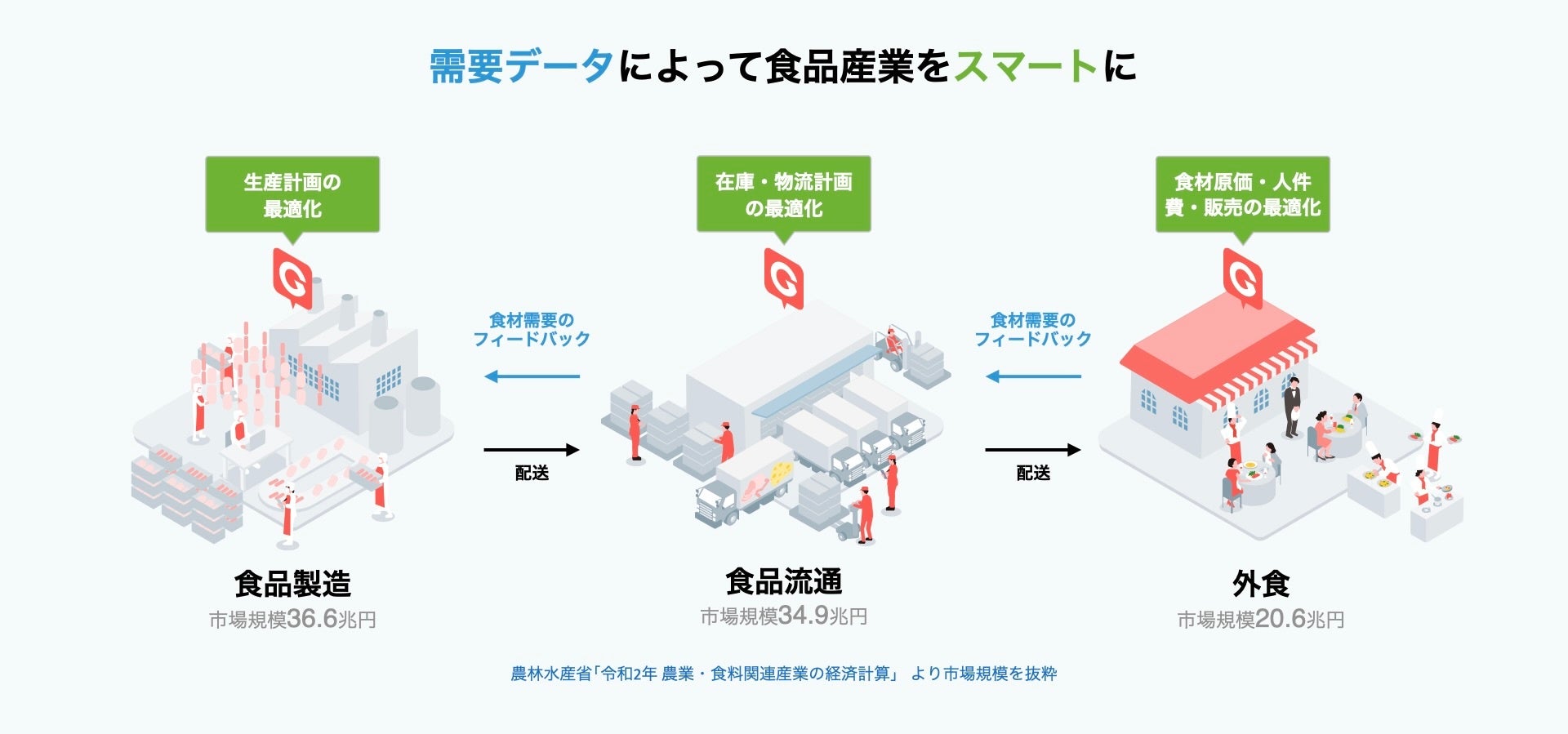 日本の食品産業は、年間9兆円近くの産業起因の食品ロス、食材価格の高騰、人手不足・労働環境問題などの課題を抱えています。当社は「フードビジネスの利益率とスケーラビリティを最高水準に」をミッションに掲げ、現場オペレーションの改善からサプライチェーンの最適化で産業課題の解決を目指し、まず外食産業の業務改善に着手しています。