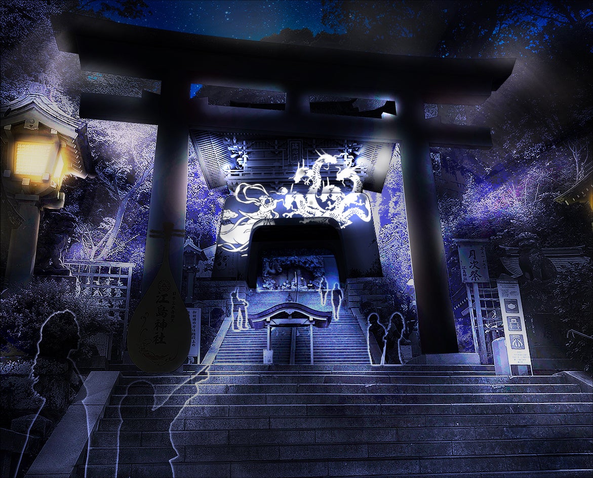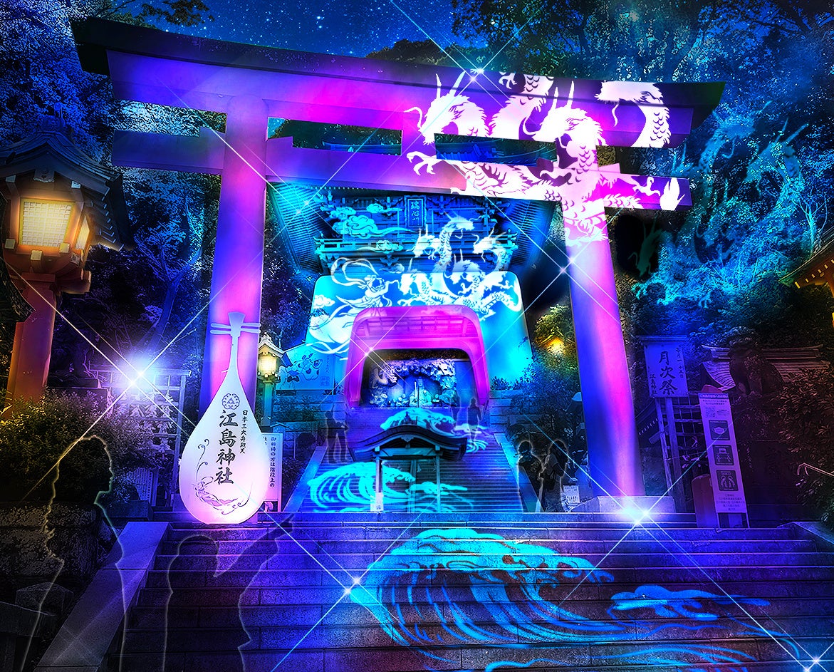 江島神社の瑞⼼⾨から石段、そして辺津宮を舞台に展開する“光の絵巻”は、江の島誕⽣の伝承『江島縁起』から着想を得た表現を中心に、光のインスタレーションとして毎年バージョンアップを重ねています。
