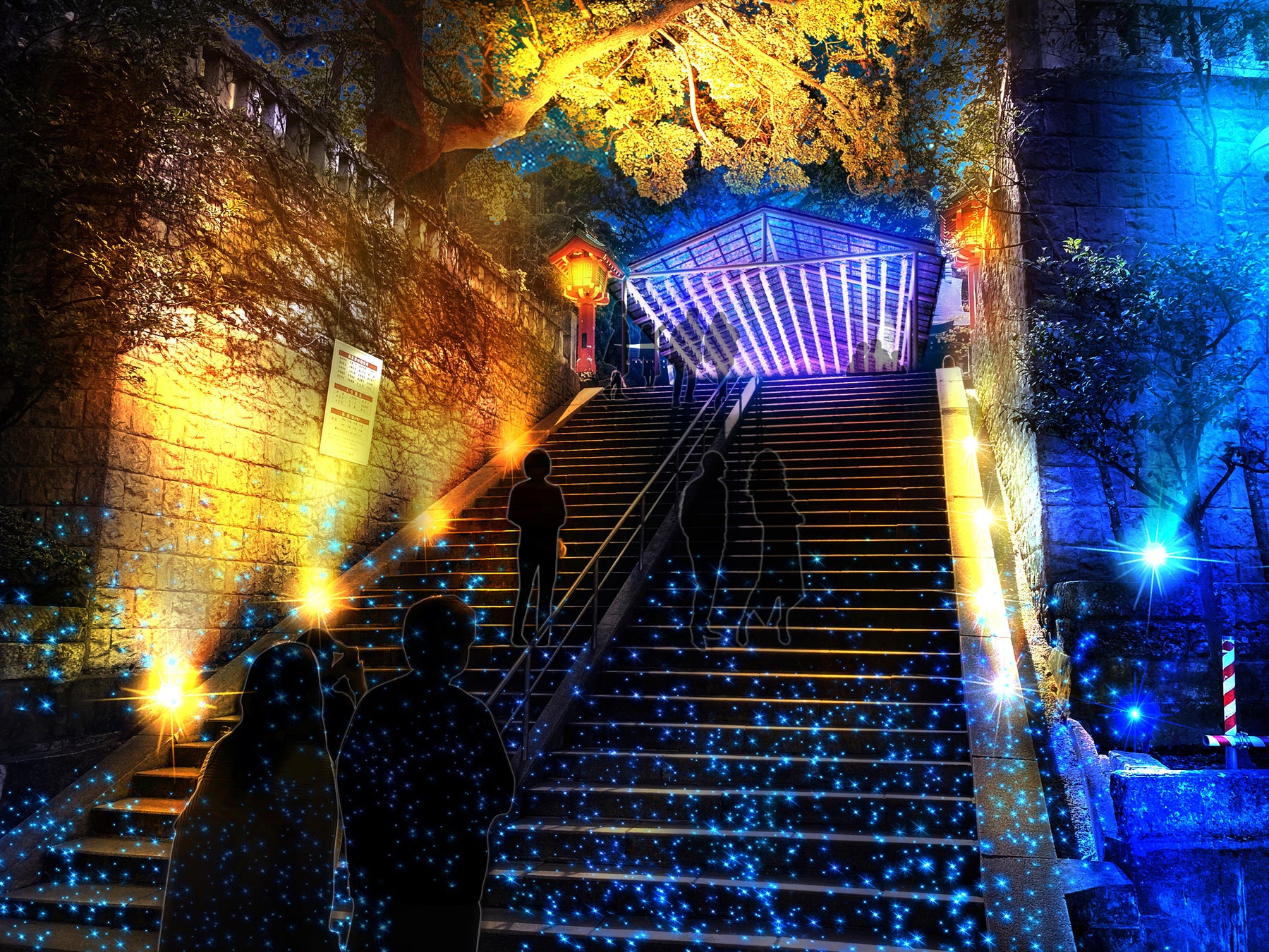 江島神社 瑞心門〜石段〜辺津宮を華やかに彩る“光の絵巻”夏の夕涼みを感じる“貝細工モチーフ”の光の切り絵も新登場