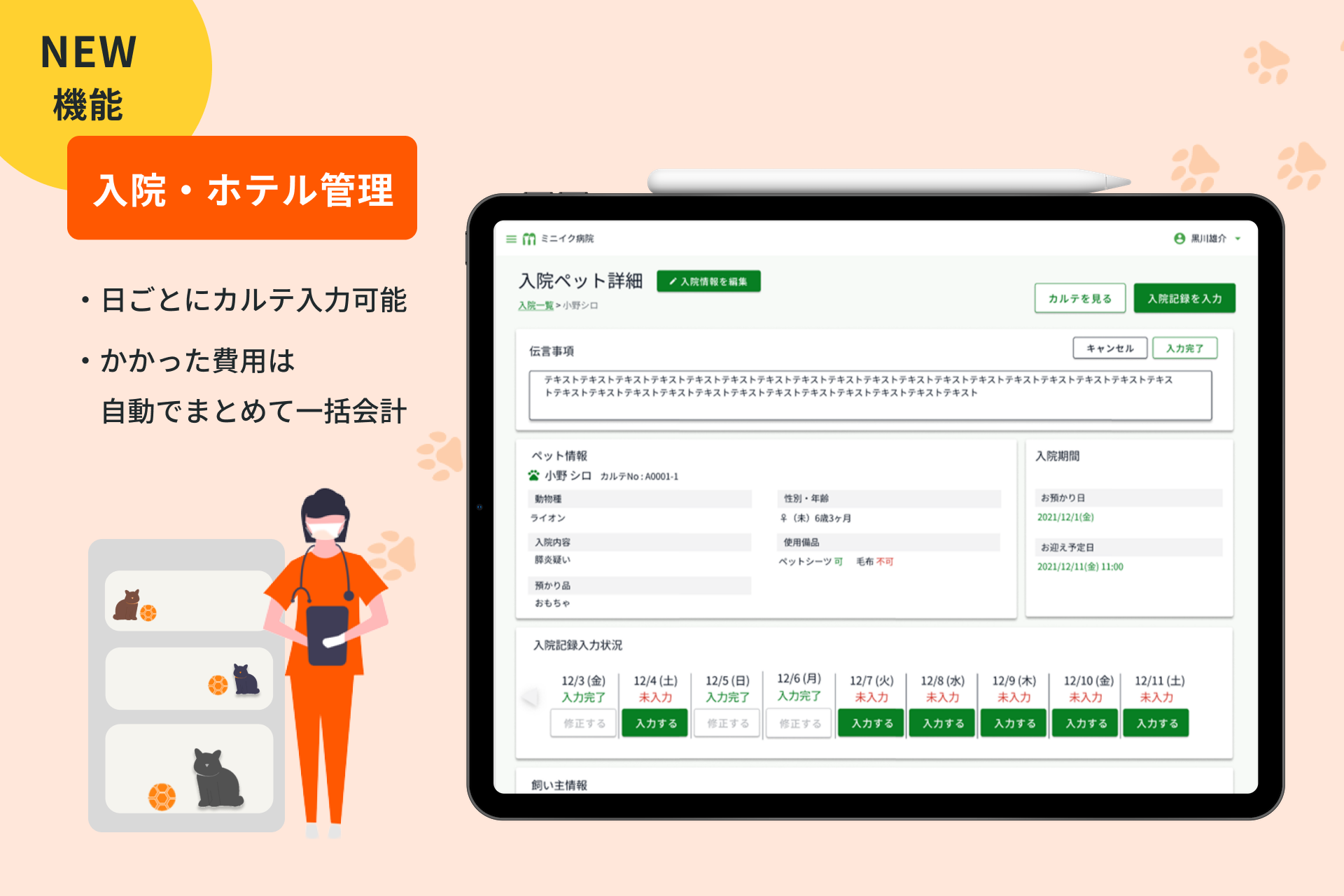業務時間が不足しがちな動物病院では、忙しさのあまりスタッフ間の情報共有が行き届かないことや、精算時の集計ミスが起こり得るのではないかと考えました。入院管理機能では、些細な体調の変化や注意事項等を必ずスタッフ間で共有できるよう「伝言事項」を最上部に表示することと、いかに会計処理を”らく”にできるかにこだわりました。ミニイクでは当事者目線に立ち、どうすればお役に立てるかを考えながら機能開発に取り組んでいます。