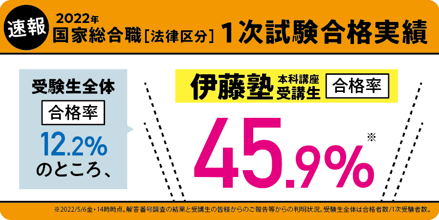 公務員・法律資格専門の受験指導校『伊藤塾』(塾長 伊藤真)を運営する株式会社法学館(所在地:東京都渋谷区)は、来年(2023年)の国家総合職[法律区分]合格目標ゼミの受付を開始します。こちらも早期に定員に達する可能性がありますので、早めのお申し込みをおすすめします。