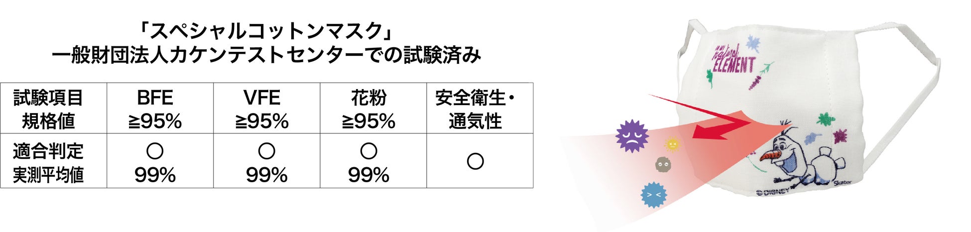 この度、弊社(スケーター株式会社)が製作した「スペシャルコットンマスク」はコットン12層に挟んだ1層の「不織布フィルタ」が99%の花粉・細菌飛沫・ウイルス飛沫カットを実現。コットンマスクでありながら不織布マスクと同等の防除機能を有し、コットンマスクの特性(息がしやすい、肌にやさしい、ファッション性が高い、洗える)も併せ持つ製品です。