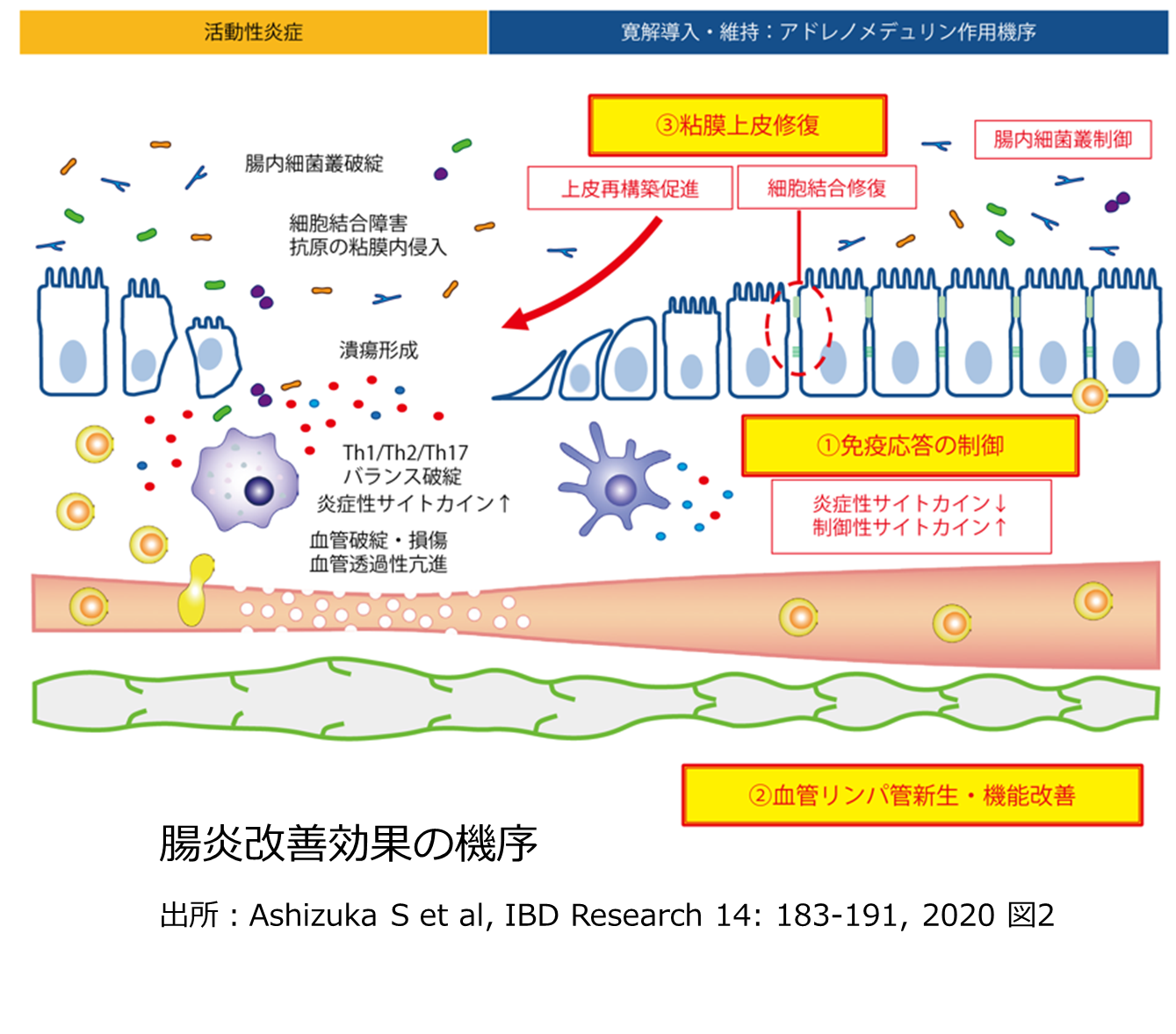 AMは上皮細胞のバリア機能の修復・維持に関わる物質です。慢性炎症により傷んだ腸粘膜の修復を促進します(右図参照)。また、AMは、抗炎症・免疫抑制を主作用とする医薬品とはたらき(機序)が異なるため、副作用リスクが低い特長も備えています。