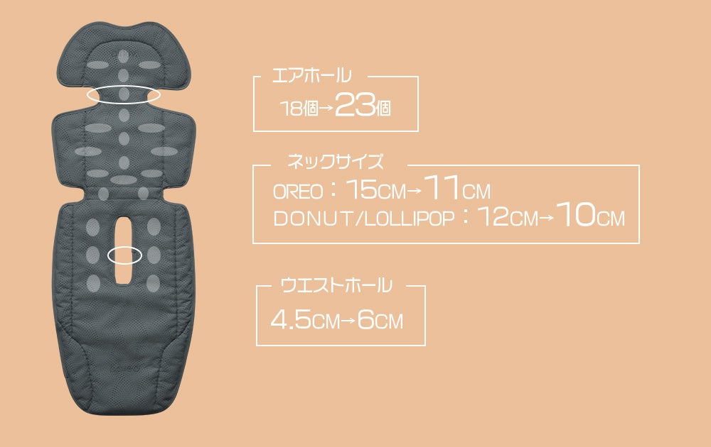 製品のネックサイズが細くなり、ベビーカーやチャイルドシートのショルダーベルトへの干渉を軽減