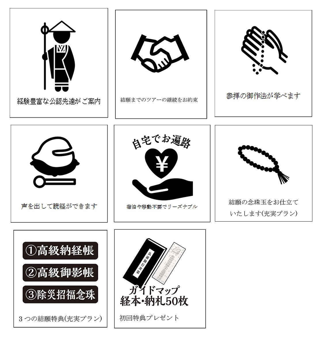 基本的な参拝用品に、納経帳・御朱印料・御影帳・念珠仕上げ品等、すべてを含んだプランです。