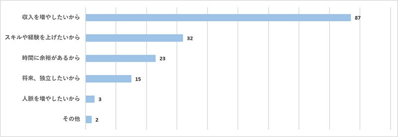 「収入を増やしたいから」が87件で最多となり、続いて「スキルや経験を上げたいから」32件、「時間に余裕があるから」23件という結果になりました。