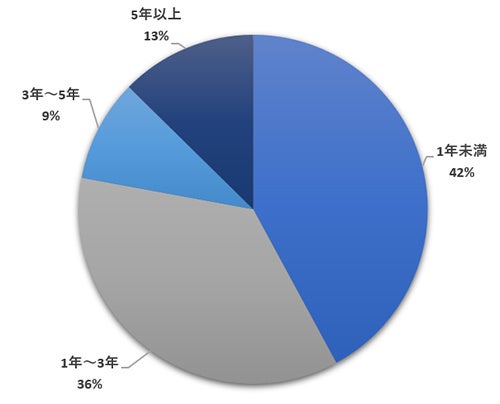 1年未満:43人(42%)、1年~3年:36人(36%)、3年~5年:10人(9%)、5年以上:13人(13%)