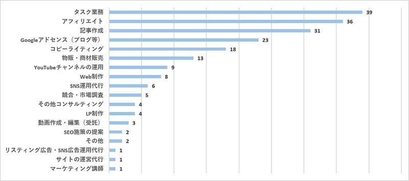 今回の調査結果では、「タスク業務」が39件で最多となり、続いて「アフィリエイト」36件、「記事作成」31件という結果でした。