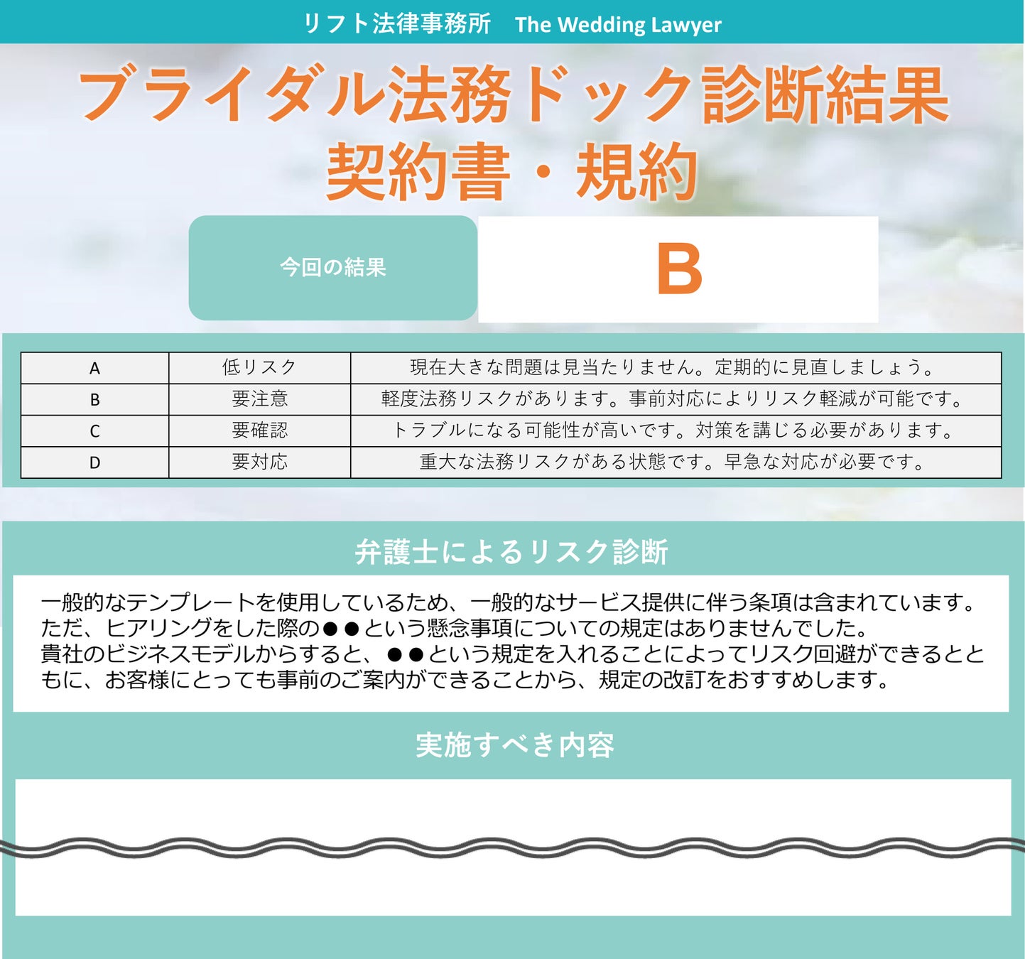 診断結果において、万が一リスクや課題が見つかった場合には、ブライダル・ウエディング業界に強い弁護士がしっかりと解説し、改善点をアドバイスいたします。