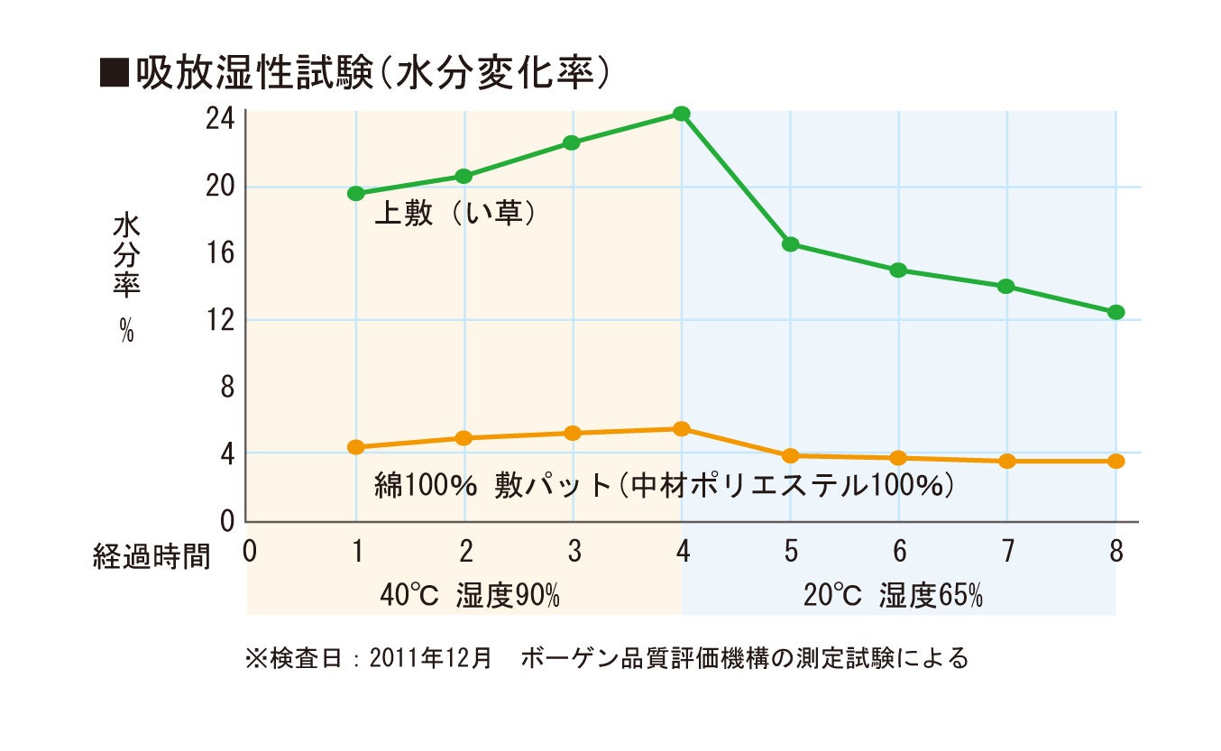 い草のスポンジ構造には湿気が多い環境では水分を吸収し、乾燥した環境で保持している水分を放出する調湿機能があります。 優れた調湿機能でジメジメ感を抑え、さらっと快適に過ごせるので「天然のクーラー」と呼ばれています。
