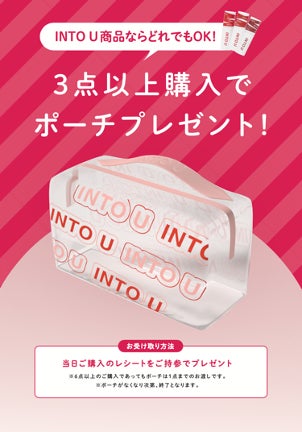 店頭では、INTO Uの商品を3点以上ご購入いただいた方に、INTO Uオリジナルの透明化粧ポーチをプレゼントするノベルティもご用意しています。