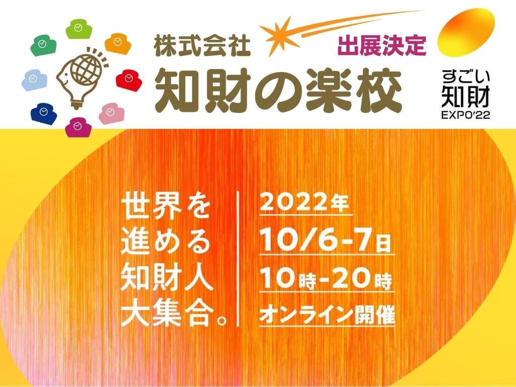 株式会社知財の楽校(本社:千葉県千葉市、代表取締役:玉利泰成)は、2022年10月6日~7日に開催される “すごい知財EXPO2022” に出展致します。ご来場者様への特典をご用意してお待ちしております。イベントの基本情報・知財の楽校の出展情報と合わせてご確認ください。