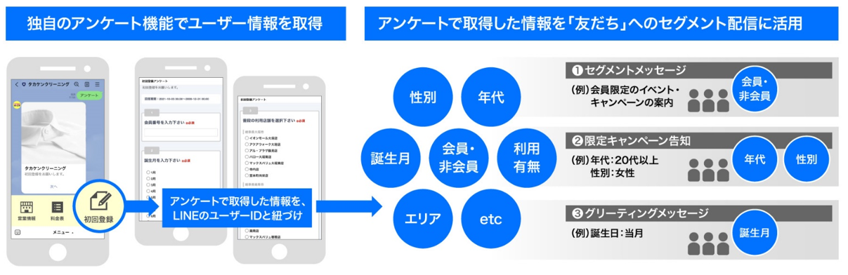 株式会社クラブネッツ(本社:東京都渋谷区、代表取締役社長:冨安仁)は、タカケンサンシャイン株式会社(本社:岐阜県大垣市、 代表取締役社長:髙木健志)が運営するクリーニング店「タカケンクリーニング」(https://www.takaken-sunshine.co.jp/)にLINE公式アカウントを開設、さらにクラブネッツ独自開発のLINE公式アカウントの拡張サービス「+DIRECT(プラスダイレクト)」を導入し、クリーニング利用ユーザー(会員)からLINE経由にてアンケートを実施し情報収集、それを自社の会員データベースと連携させ、会員の利用情報・ニーズに合わせたセグメント配信を行うことができる機能拡張を行いました。