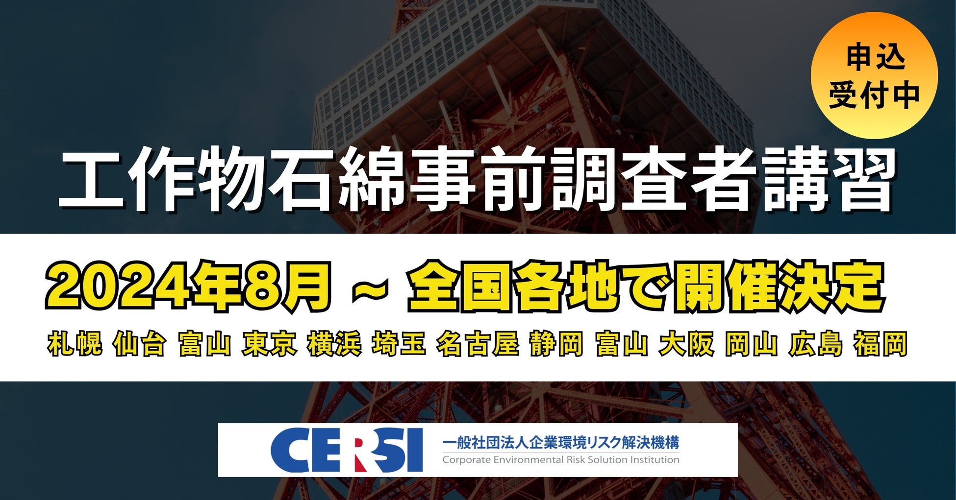 【申込受付開始】工作物石綿事前調査者講習を、東京・名古屋・大阪含む全国各地で、2024年8月より定期開催いたします。