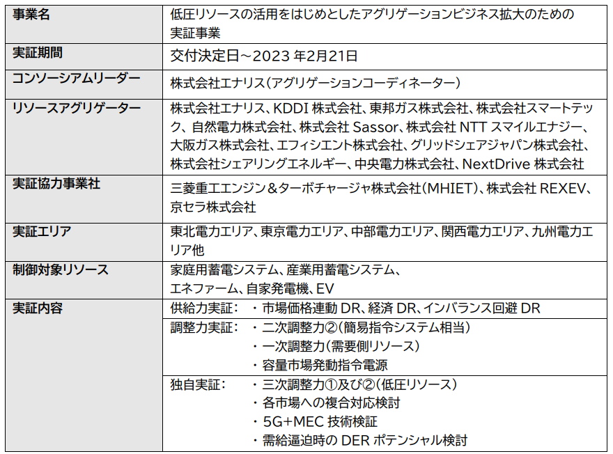 本実証では、アグリゲーションコーディネーターのエナリス社を中心に、蓄電池・DRを含む多様な分散型エネルギーリソースを活用して電力の安定供給等に資するアグリゲーションビジネスの可能性について、当社を含む16社が参加し、多様な事業を展開し検証してまいります。本実証を通して技術の高度化、制御精度の向上、収益性評価に取り組み、アグリゲーションビジネスの発展に寄与してまいります。