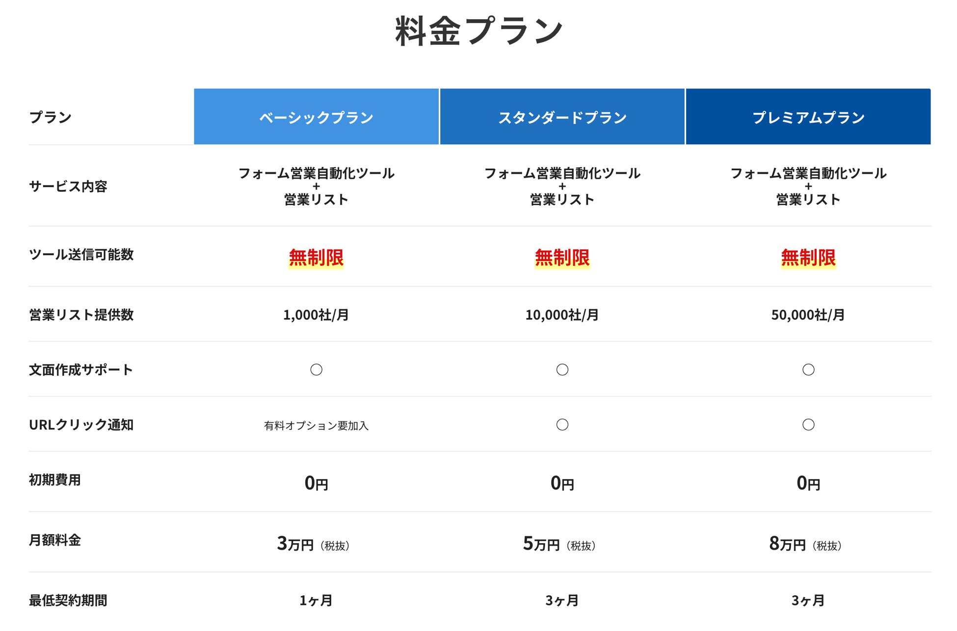 送信無制限、営業リスト提供1,000件/月、初期費用0円、月額3万円(税抜)