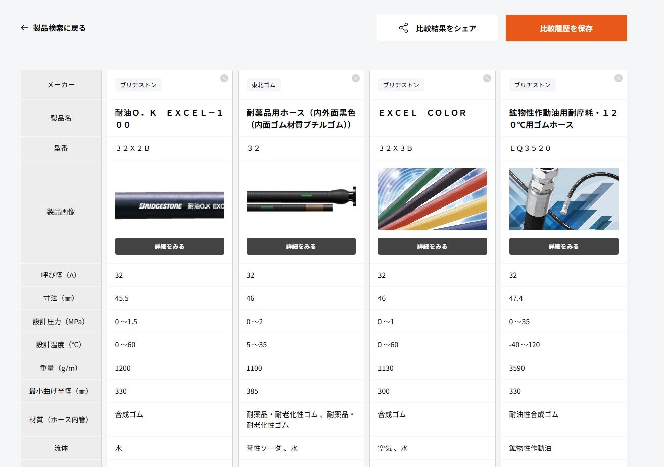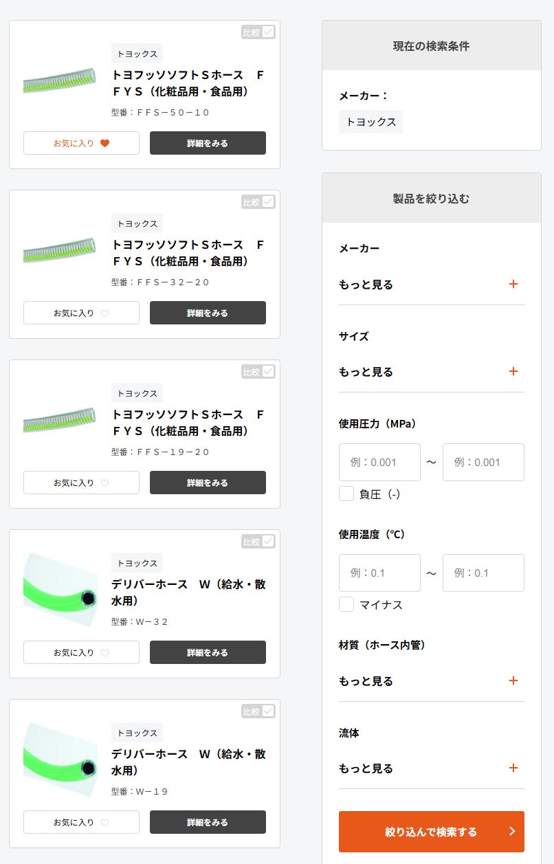 無料でどなたでも利用でき、ホースの条件を選択していただくことで、簡単に最適なホースを検索できます。