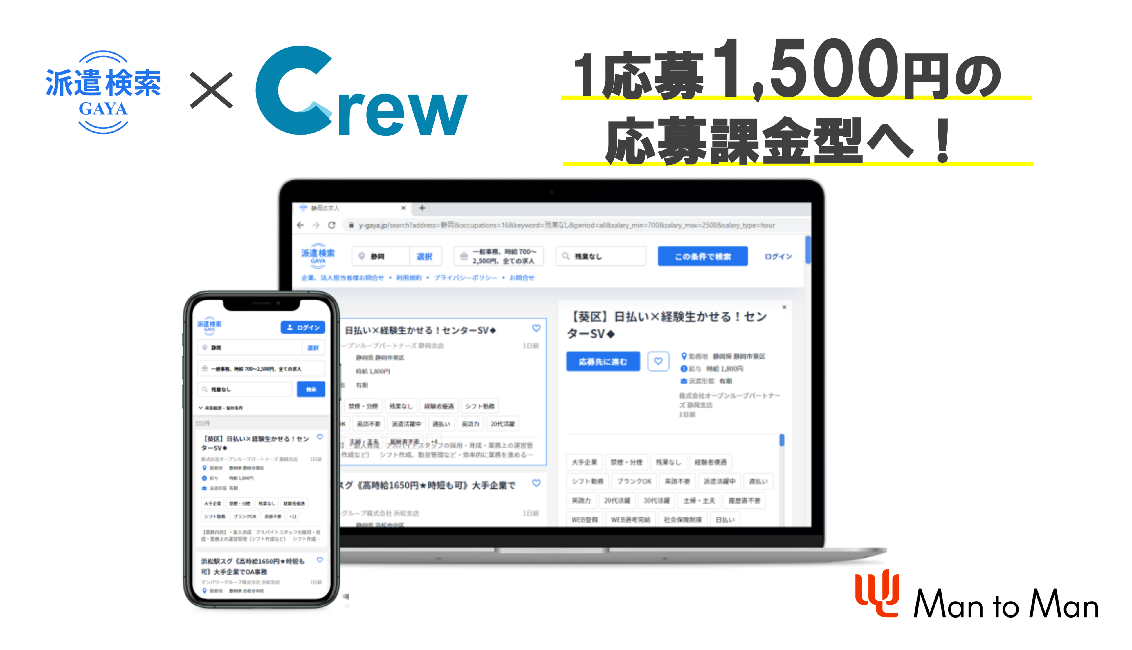 総合人材サービス事業を展開するMan to Man株式会社(本社:愛知県名古屋市 取締役社長:手島雄一 以下、当社)は、人材業界初となる「派遣の仕事探し」専門の求人検索サイト「GAYA(ガヤ)以下、GAYA」と同時リリースした人材派遣企業向け求人登録データベース「Crew(クルー)以下、Crew」の料金改定を行いました。