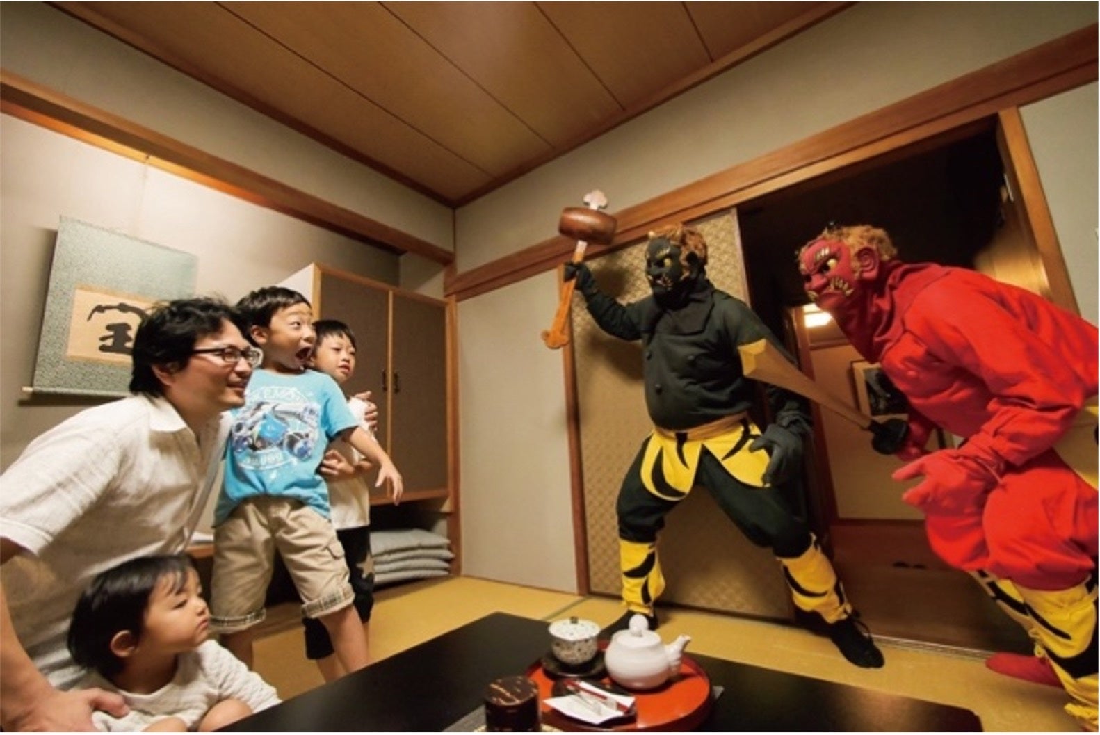 鬼が宿泊施設に潜入し、泊り客を驚かせます。