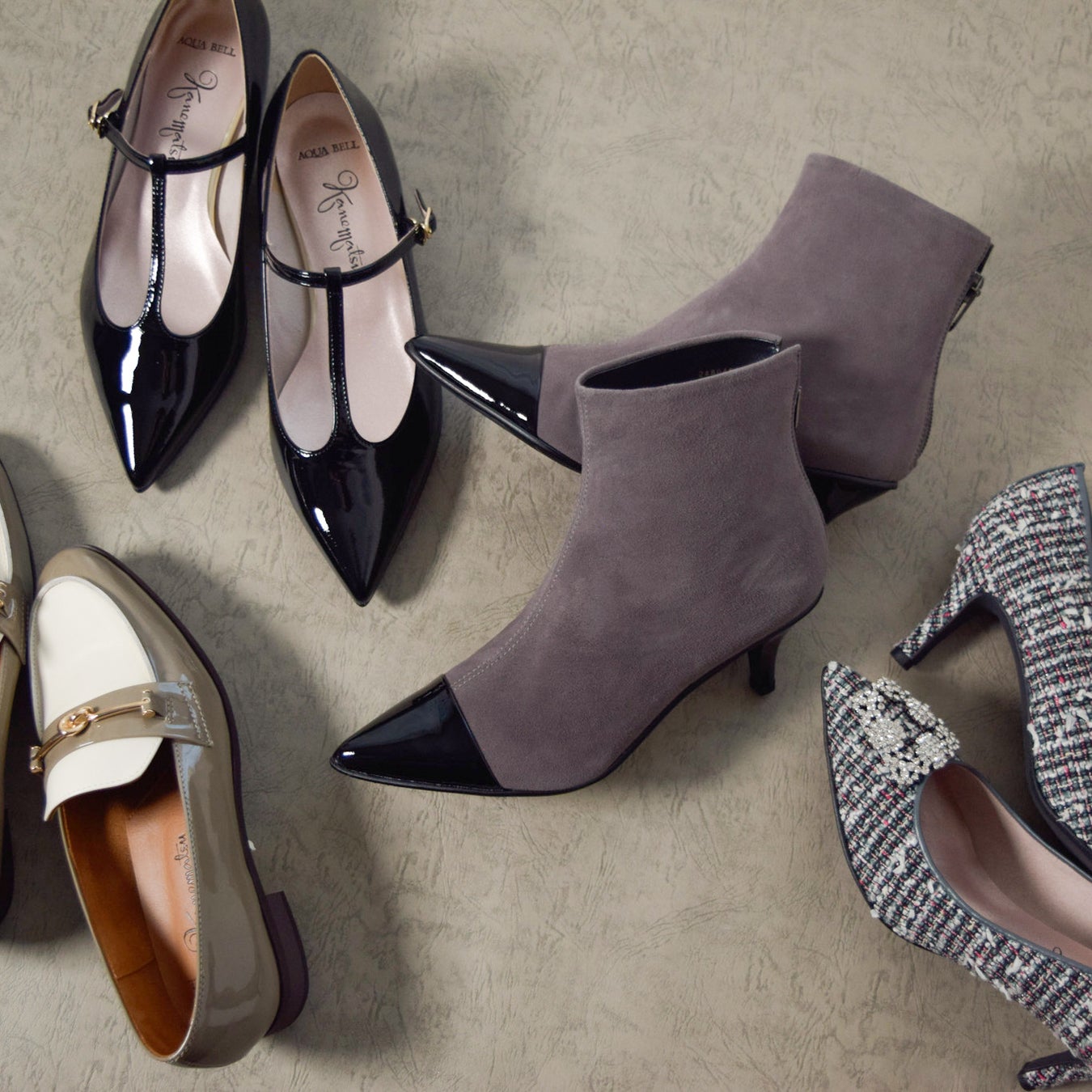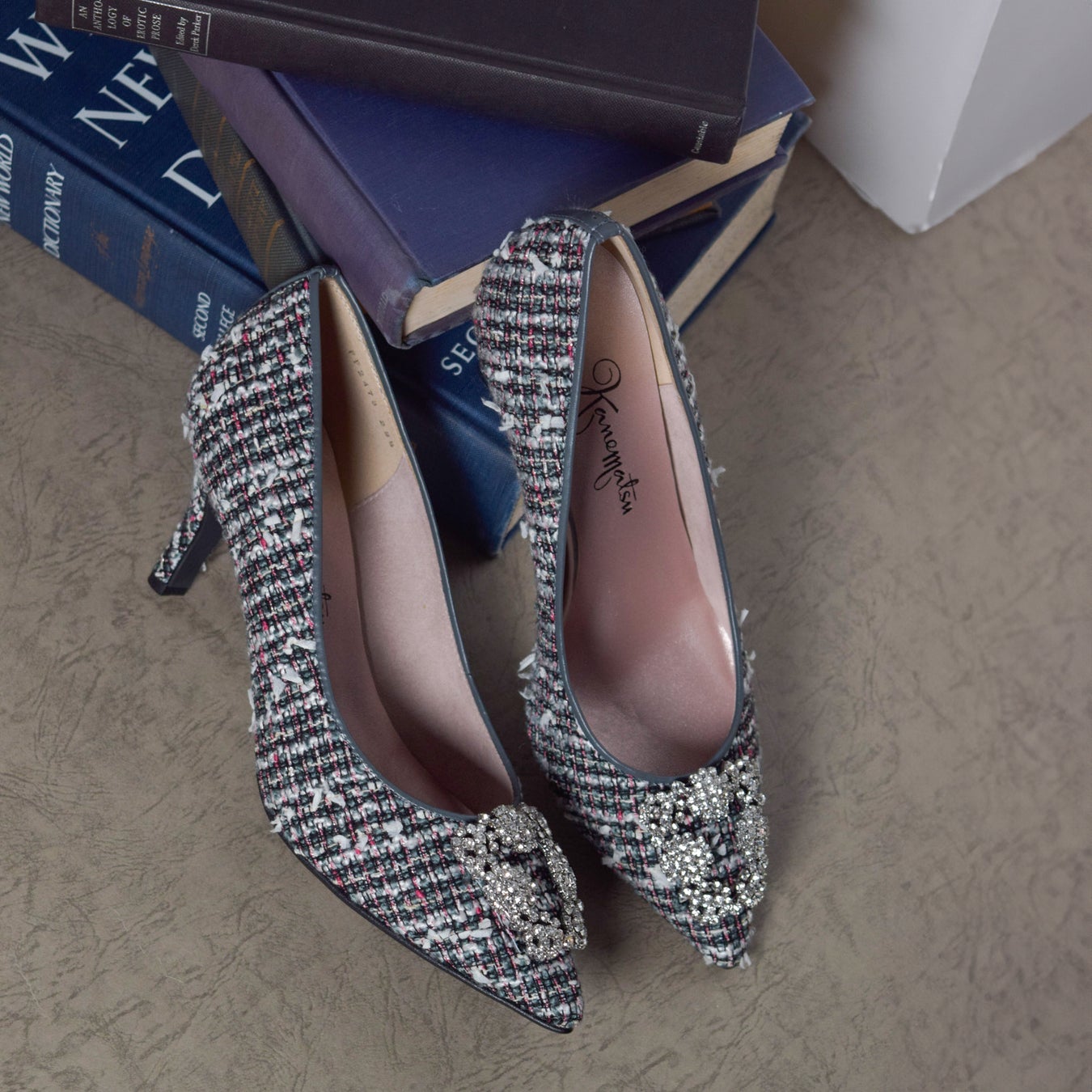 また、秋の季節感を先取りするツイード素材のヒールシューズは、華やかさと履き回し力を両立させたデザイン。ビジュー付きバックルがエレガントさを引き立てます。
