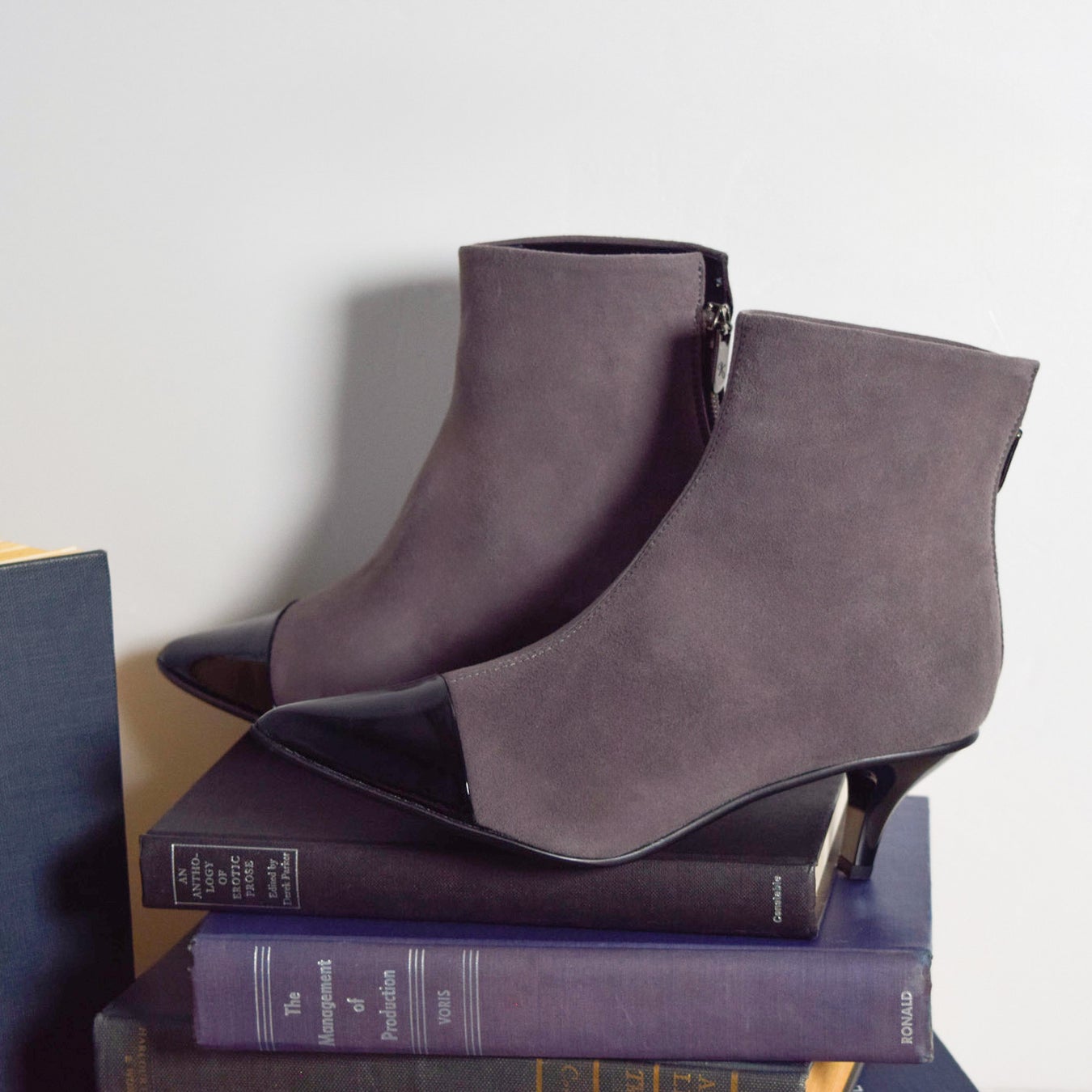 注目アイテムとして、クラシックなスタイルにモダンな要素を加えた新作を展開。撥水加工を施したグレーのスエード素材とエナメルトゥのショートブーツは、上品さと機能性を兼ね備え、急な雨にも対応できる安心のアイテムです。
