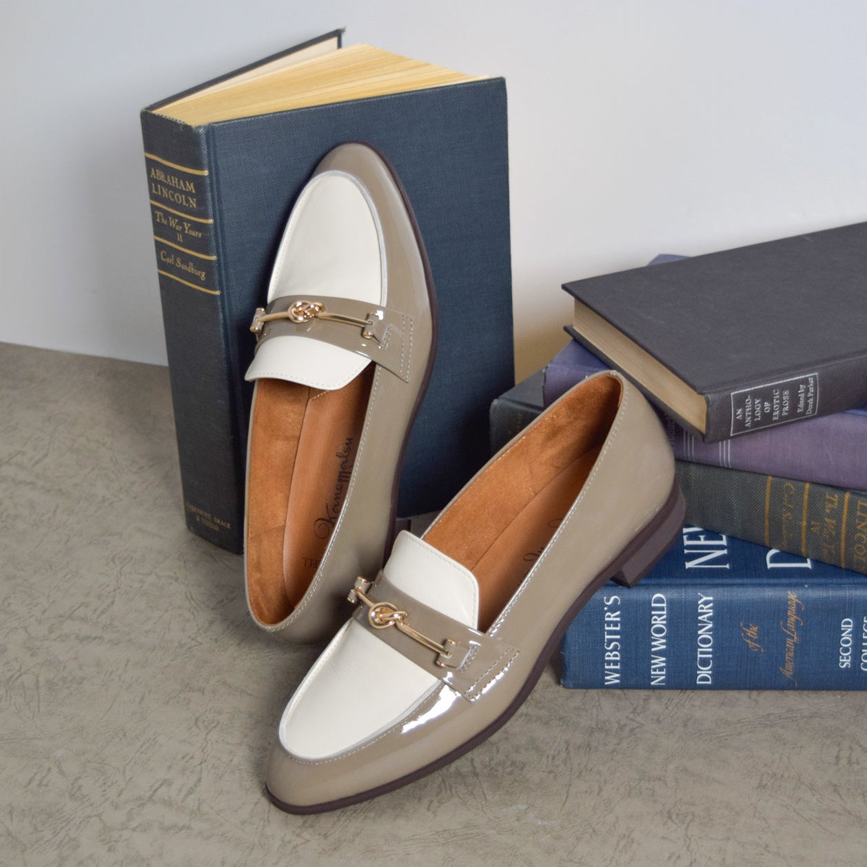 定番のローファーも、グレージュとアイボリーの柔らかいトーンに、ノットモチーフを加えて新鮮な雰囲気で登場。トラッドスタイルをシックにまとめ、さまざまなコーディネートに活躍します。