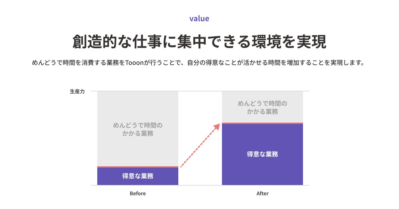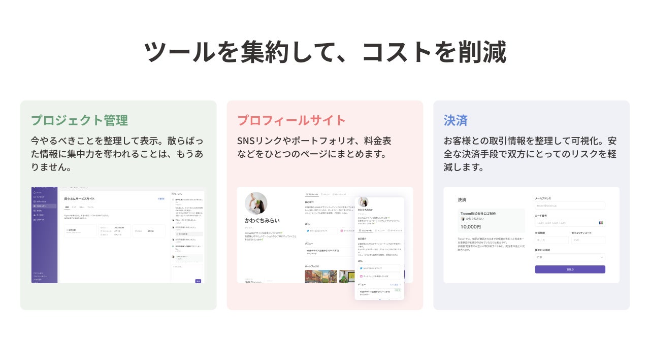 Tooonは、フリーランス・クリエイターの活動に特化したオールインワークスペースです。個人で活動するうえで発生するめんどうな業務を、Tooonの利用によって削減・効率化を行ってまいります。