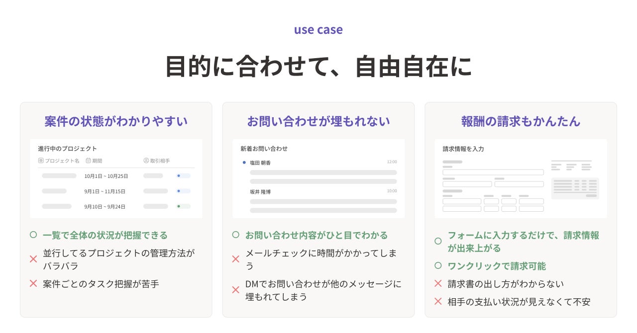 お仕事依頼の獲得、クライアントとの契約・納品・決済、自身のタスク管理まで一元管理が可能に。フリーランス・クリエイターにとってのパーソナルアシスタントを目指す。