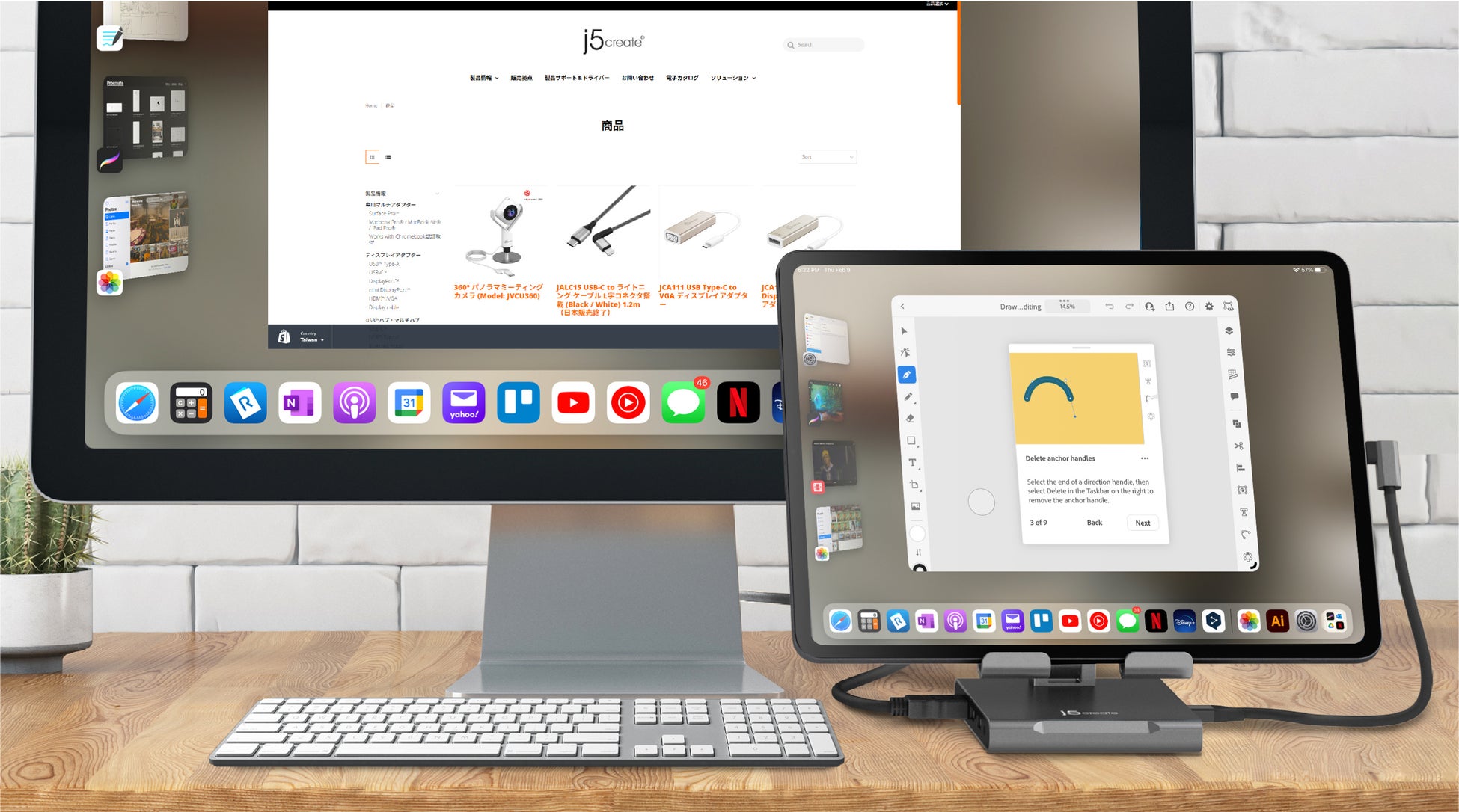 本製品は、iPad Pro/Air/miniやAndroidタブレット、USB-Cを備えたタブレットなどを、自由に角度の調整をしながら、無段階スタンドに乗せた状態で、本体に内蔵しているドッキングステーションで、一気に7つの機能を拡張することができます。