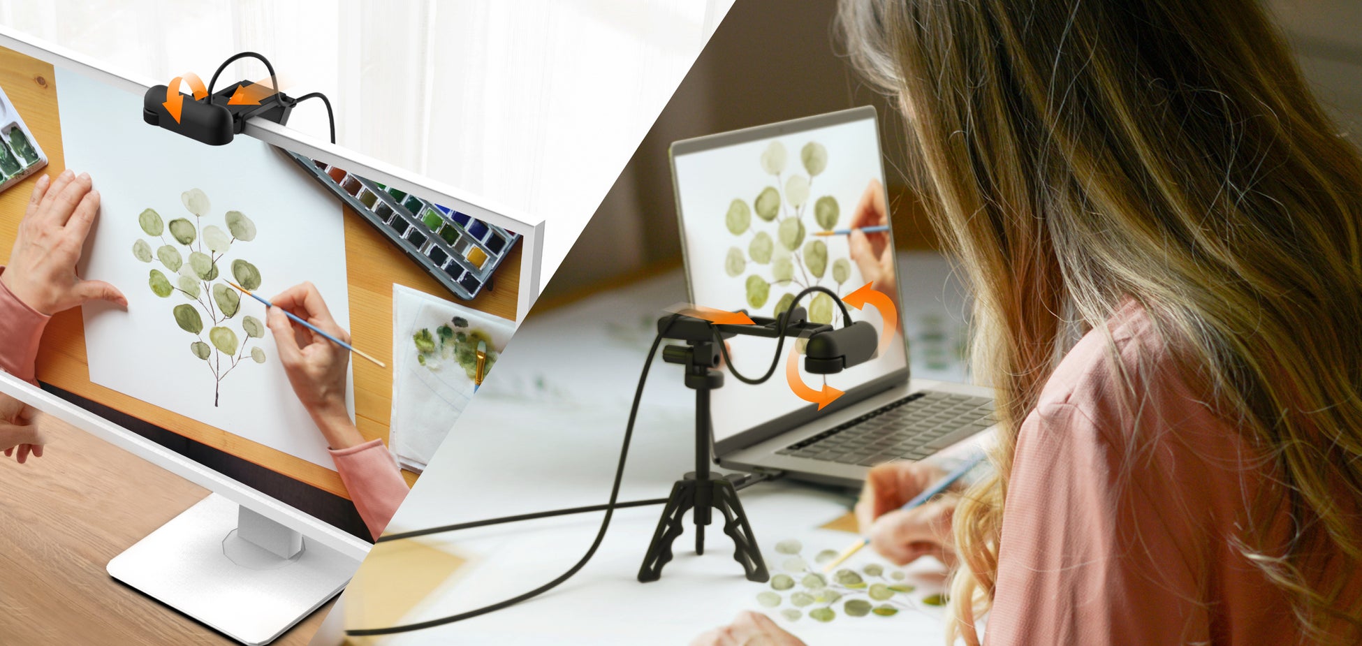 自社開発の可変式クリップを用いて、カメラを前に90度倒すことで、自然にデスクの書類を写すことができます。一切ソフトウェアをインストールする必要がなく、直感的にカメラを倒してディスプレイや別途用意の三脚に固定して使用できます。赤いボタンを長押しすることで、パソコンに取り込む映像が180度回転するため、ソフトの調整が不要で簡単に向きを変更して相手に映すことができます。