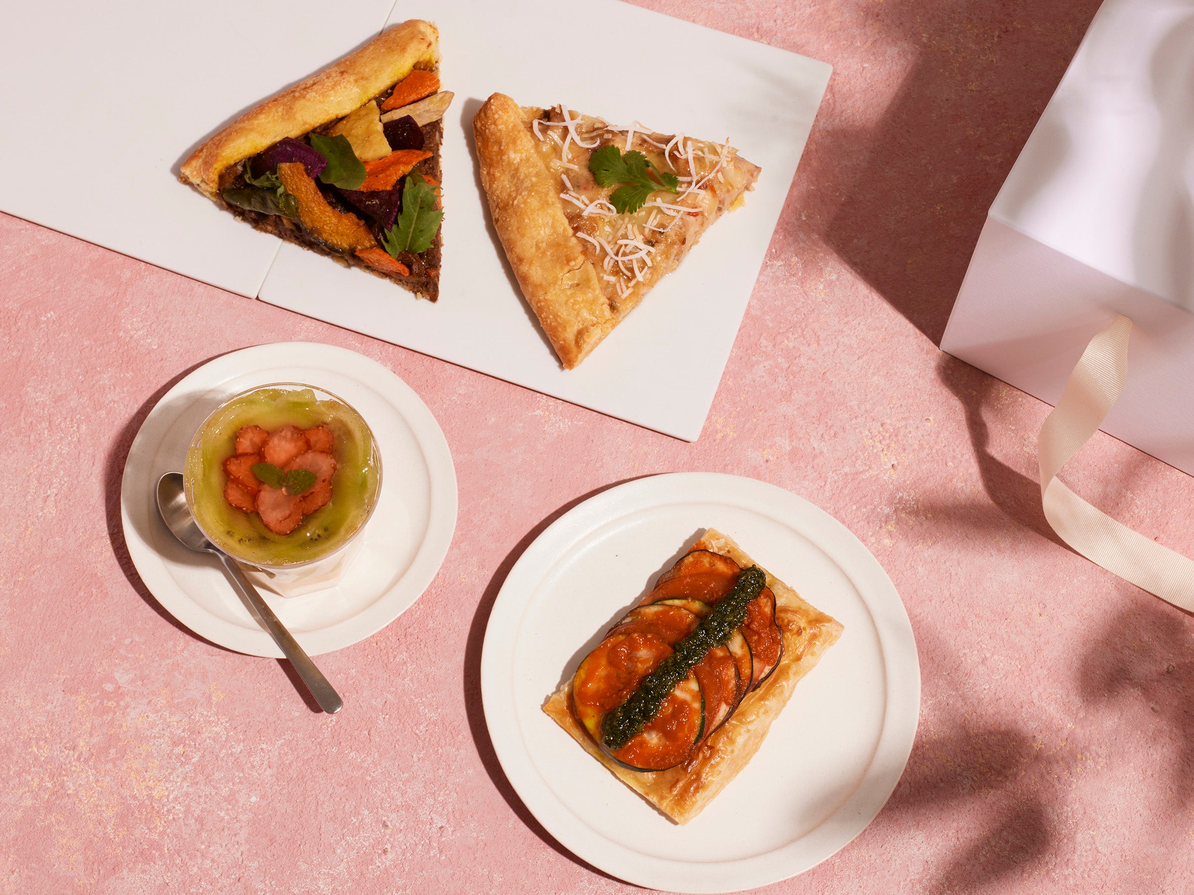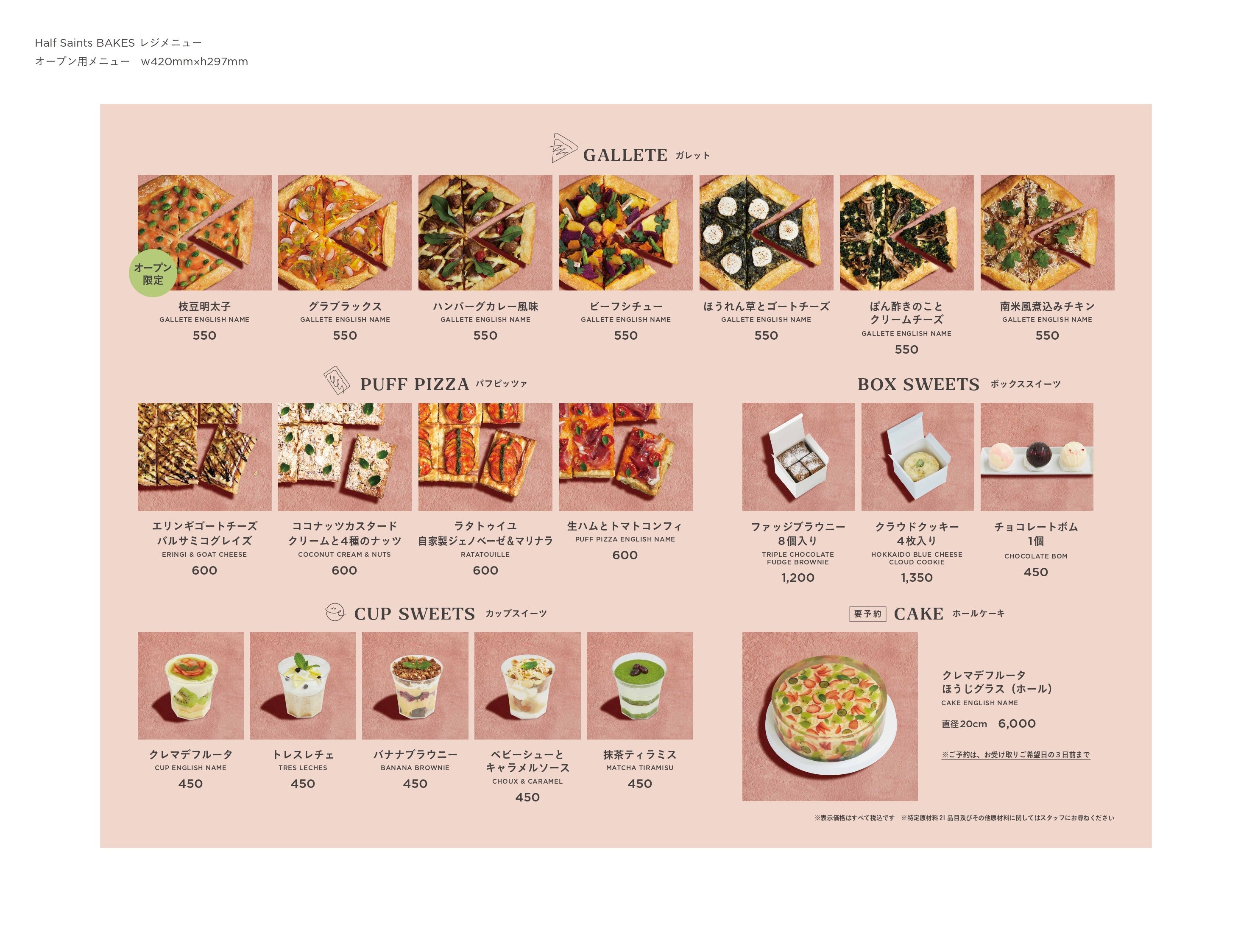 今回の新業態Half Saints BAKESは、Half Saintsのディフュージョンラインです。日本をはじめ、イタリア、フランス、ギリシャ、南米、フィリピンなど世界各国の「美味しい」インスピレーションをパフピッツァ(4種類)、ガレット(8種類)、カップスイーツ(5種類)にアレンジし、お召し上がりいただきやすいスタイルでご提供するモダンベーカリーです。