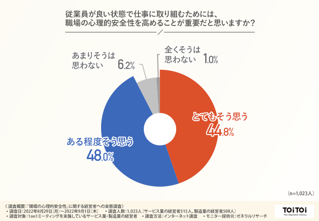- 経営者の9割以上が、従業員が良い状態で仕事に取り組むためには心理的安全性が重要と回答