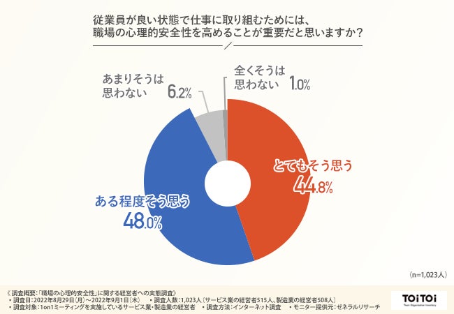 続いて、「従業員が良い状態で仕事に取り組むためには、職場の心理的安全性を高めることが重要だと思いますか?」と質問したところ、『とてもそう思う(44.8%)』『ある程度そう思う(48.0%)』と、9割以上の経営者がそう思うと回答しました。